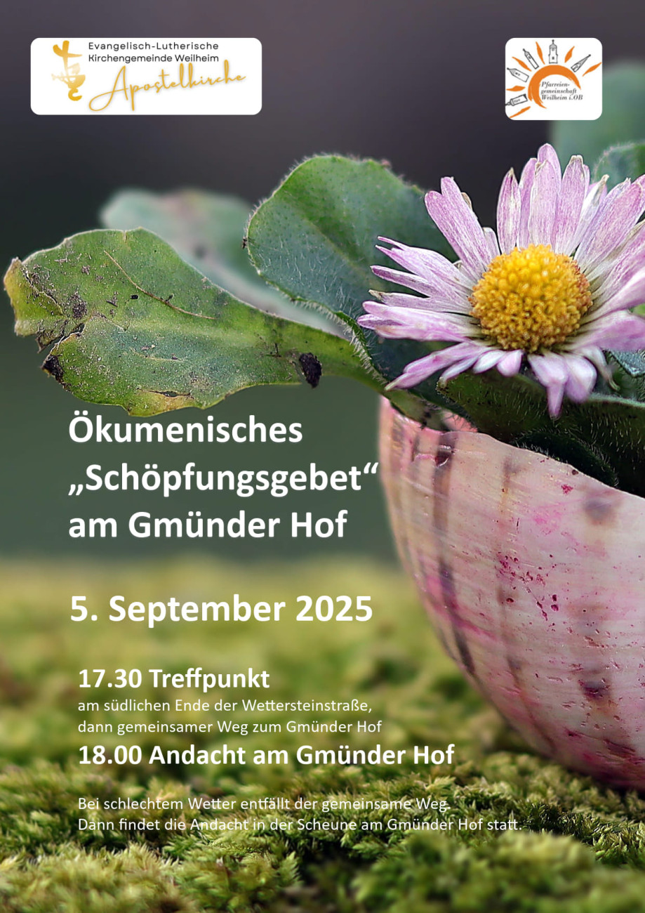 Nehmen Sie an einer ganz besonderen Veranstaltung teil, dem ökumenischen Schöpfungsgebet! Treffpunkt ist am Wendehammer der Wettersteinstraße in Weilheim. Von hier aus geht es über mehrere Stationen zum Gmünder Hof, wo gegen 18 Uhr mit Pfarrerin Sabine Nagel und Diakon Christian Lang eine Andacht gefeiert wird.