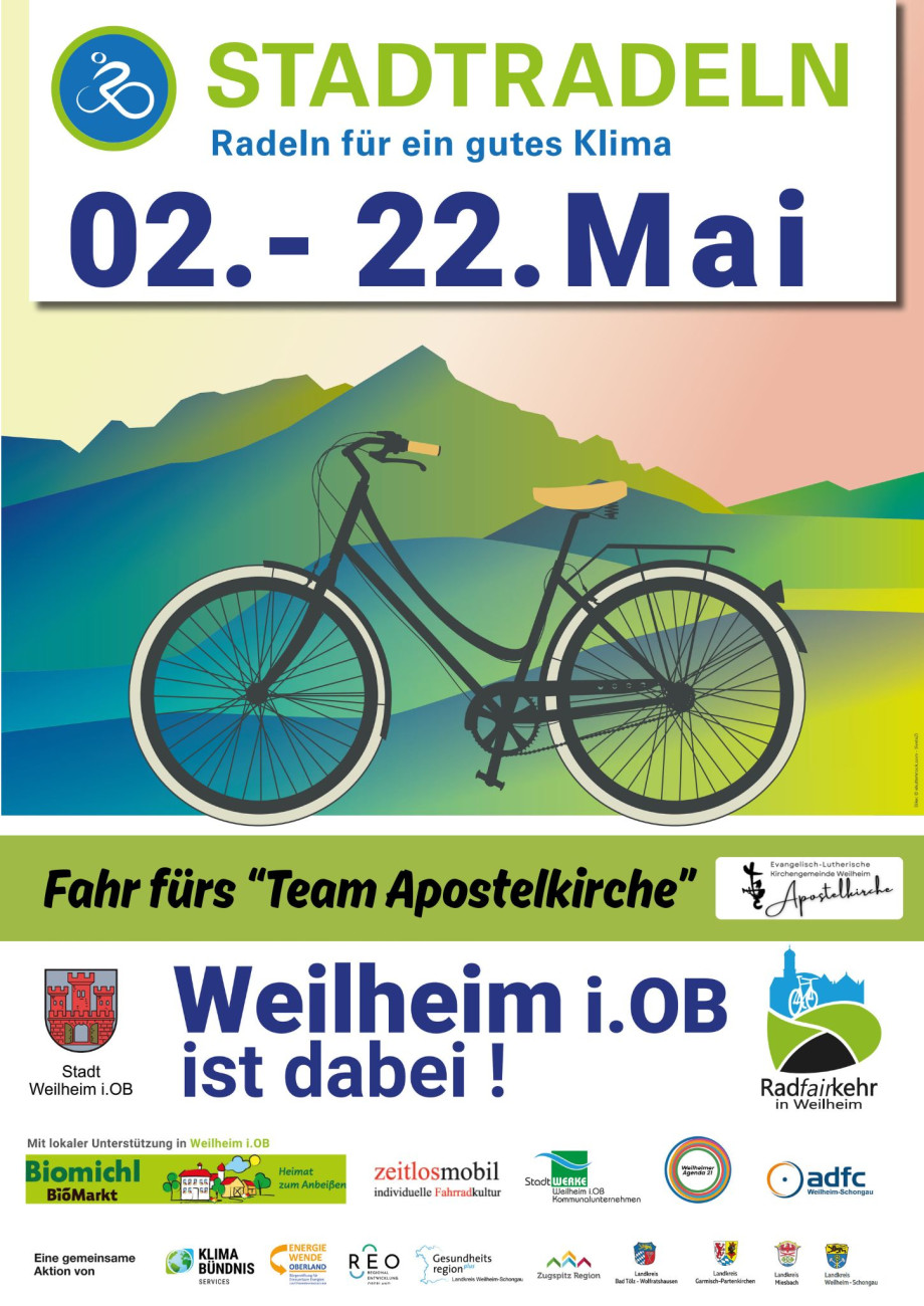 Stadtradeln 2026 - Die Stadt Weilheim beteiligt sich auch dieses Jahr wieder am Stadtradeln, vom 02. bis 22. Mai. Wir als Kirchengemeinde machen mit. Melden Sie sich an und fahren Sie für's "Team Apostelkirche"! Hier geht's zur Anmeldung.